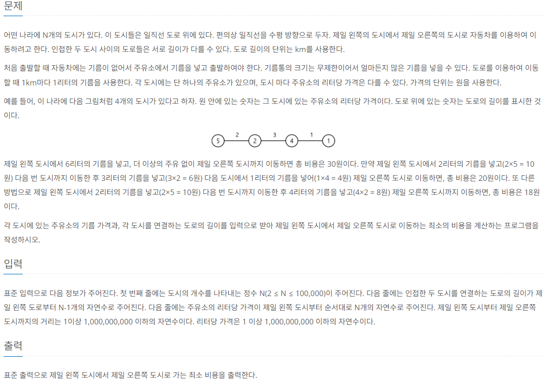 이 문제의 키 포인트는, 최적을 찾기 위해서는 현재 주요소에서 그것보다 싼 주유소가 나오기 전까지 갈 수 있는 기름을 넣어야 하는 것이다.
