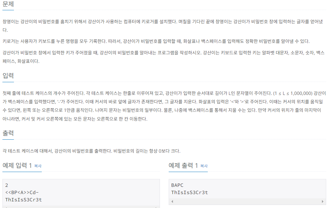 첫째 줄에 테스트 케이스의 개수가 주어진다. 각 테스트 케이스는 한줄로 이루어져 있고, 강산이가 입력한 순서대로 길이가 L인 문자열이 주어진다. (1 ≤ L ≤ 1,000,000) 강산이가 백스페이스를 입
