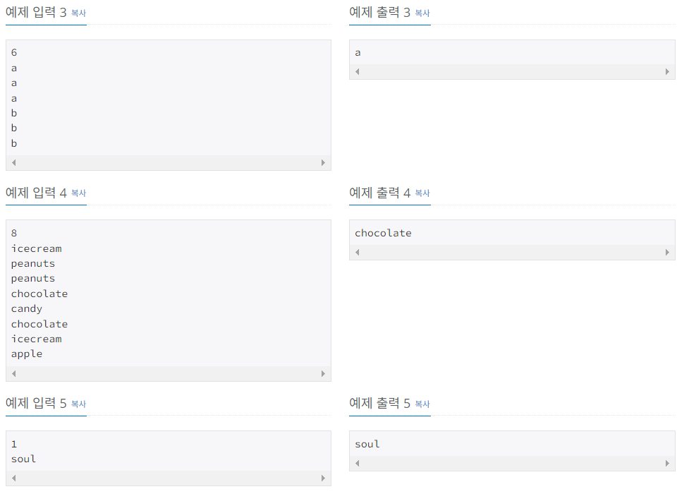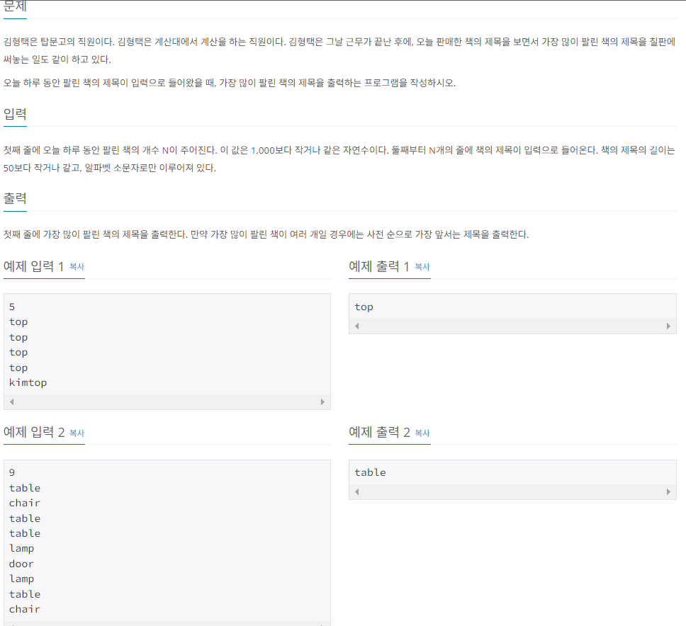 첫째 줄에 오늘 하루 동안 팔린 책의 개수 N이 주어진다. 이 값은 1,000보다 작거나 같은 자연수이다. 둘째부터 N개의 줄에 책의 제목이 입력으로 들어온다. 책의 제목의 길이는 50보다 작거나 같고