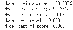 위 코드는 랜덤 포레스트 분류를 사용하고 평가지표인 accuracy, precision, recall, fl_score을 계산한 것이다.