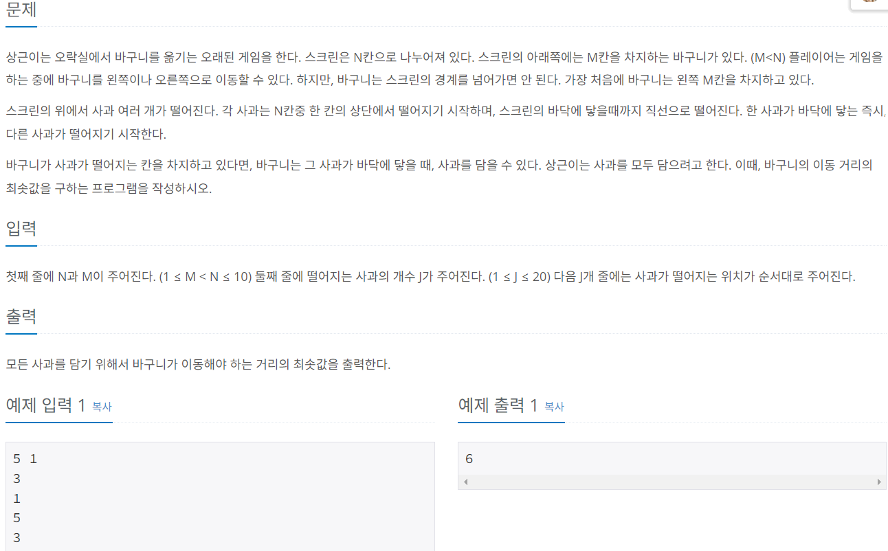 상근이는 오락실에서 바구니를 옮기는 오래된 게임을 한다. 스크린은 N칸으로 나누어져 있다. 스크린의 아래쪽에는 M칸을 차지하는 바구니가 있다. (M<N) 플레이어는 게임을 하는 중에 바구니를