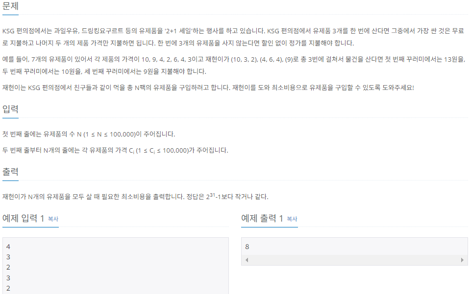 그리디 문제로, 최소가격을 내기 위해서는 무료로 받는 상품의 가격이 커야한다.