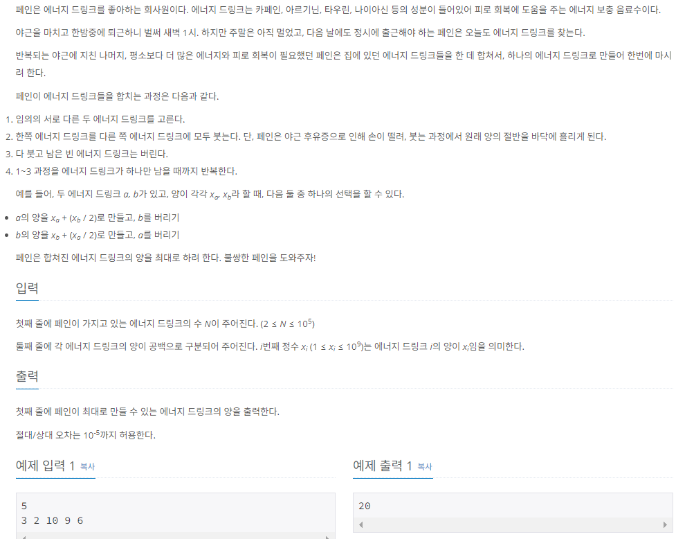(가장 작은거 / 2)+(가장 큰 거)를 반복하면 된다.