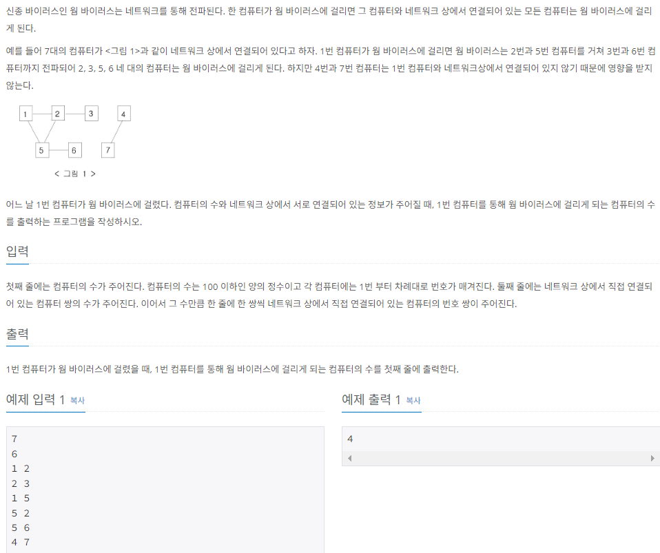 https://www.acmicpc.net/problem/2606 2606번: 바이러스 첫째 줄에는 컴퓨터의 수가 주어진다. 컴퓨터의 수는 100 이하이고 각 컴퓨터에는 1번 부터 차례대로 번호가 매겨진다. 둘째 줄에는 네트워크 상에서