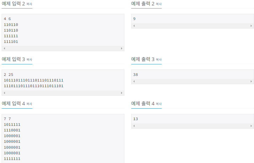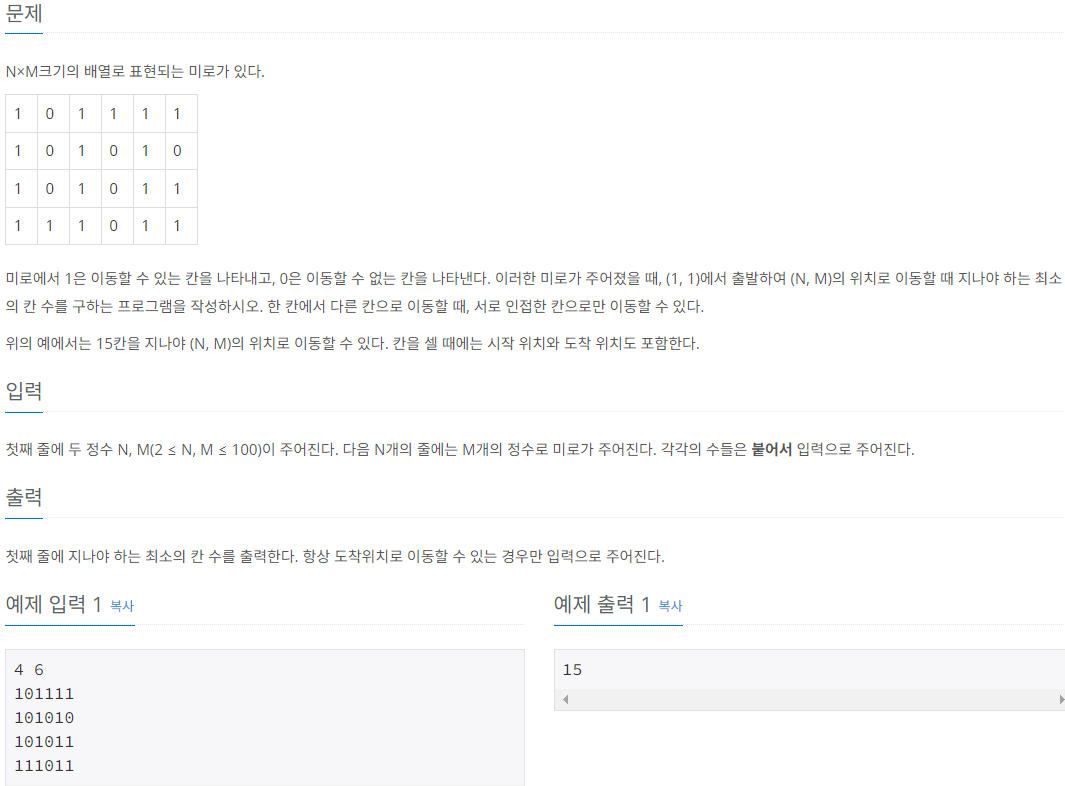 첫째 줄에 두 정수 N, M(2 ≤ N, M ≤ 100)이 주어진다. 다음 N개의 줄에는 M개의 정수로 미로가 주어진다. 각각의 수들은 붙어서 입력으로 주어진다.
