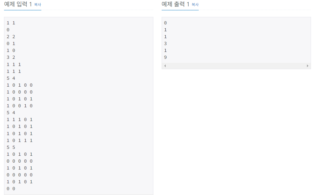 입력은 여러 개의 테스트 케이스로 이루어져 있다. 각 테스트 케이스의 첫째 줄에는 지도의 너비 w와 높이 h가 주어진다. w와 h는 50보다 작거나 같은 양의 정수이다. 둘째 줄부터 h개 줄에는 지도