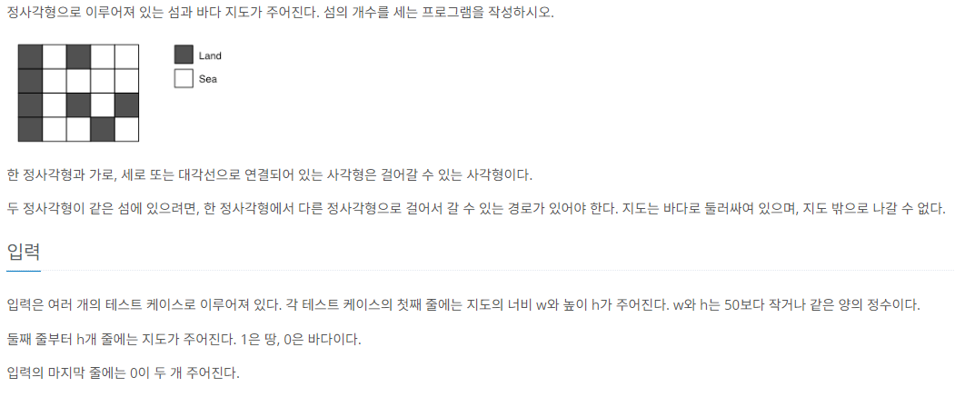 이 문제도 전형적인 dfs, bfs문제로 그냥 1인 되어있는 블럭들을 방문하는 문젠데 다른 문제와 다른게 대각선도 가능하다는 것이다. 따라서 대각선만 고려해주면 쉽다. 그리고 w랑 h 헷갈리지말기