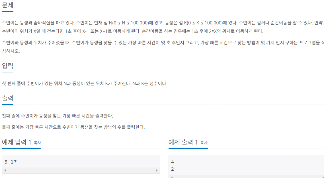 수빈이는 동생과 숨바꼭질을 하고 있다. 수빈이는 현재 점 N(0 ≤ N ≤ 100,000)에 있고, 동생은 점 K(0 ≤ K ≤ 100,000)에 있다. 수빈이는 걷거나 순간이동을 할 수 있다. 만약, 수빈이의 위치가 X일 때