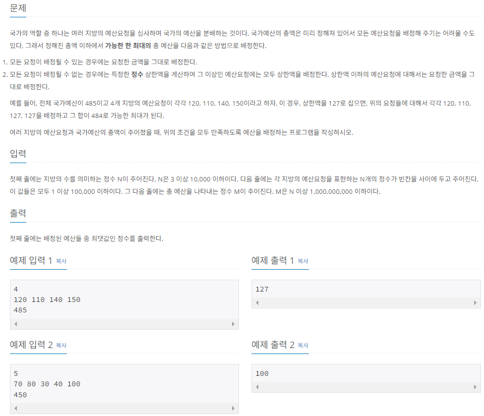 첫째 줄에는 지방의 수를 의미하는 정수 N이 주어진다. N은 3 이상 10,000 이하이다. 다음 줄에는 각 지방의 예산요청을 표현하는 N개의 정수가 빈칸을 사이에 두고 주어진다. 이 값들은 모두 1 이상