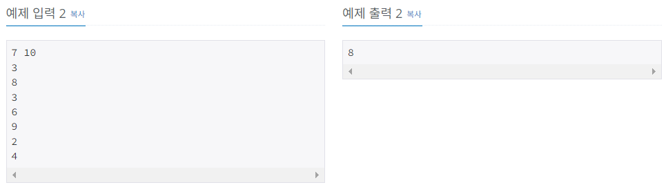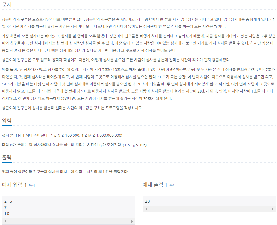 첫째 줄에 N과 M이 주어진다. (1 ≤ N ≤ 100,000, 1 ≤ M ≤ 1,000,000,000) 다음 N개 줄에는 각 심사대에서 심사를 하는데 걸리는 시간인 Tk가 주어진다. (1 ≤ Tk ≤ 109)