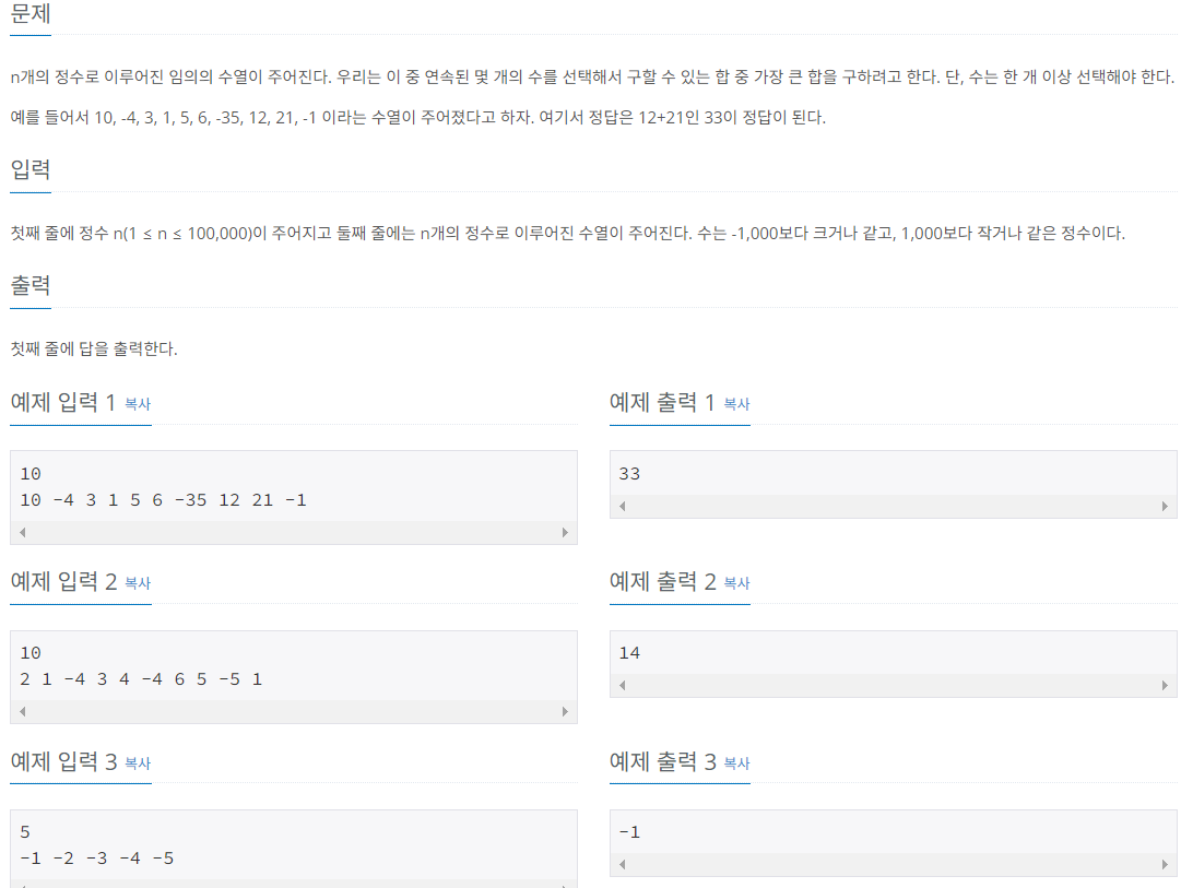 3. 지금 합에다가 음수를 더했는데, 0보다 작아질 경우 지금까지 값을 무시하고 그냥 음수값을 넣는다.