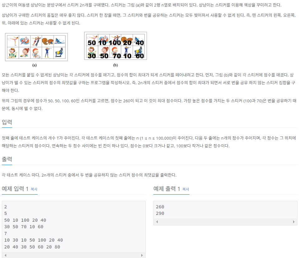 지금 칸의 스티커(graph[i][j])를 뗀다고 가정하면 이전 대각선 sticker[1-i][j-1]을 대각선 바로 왼쪽 sticker[1-i][j-2]를 선택했을 때 이다.