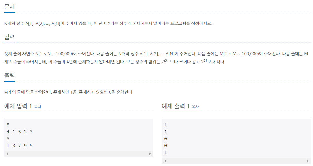 첫째 줄에 자연수 N(1 ≤ N ≤ 100,000)이 주어진다. 다음 줄에는 N개의 정수 A[1], A[2], …, A[N]이 주어진다. 다음 줄에는 M(1 ≤ M ≤ 100,000)이 주어진다. 다음 줄에는 M개의 수들이 주어지는데, 이 수들