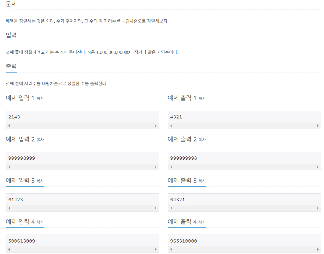 단순하게 문자열로 입력받은 이후, 정수형으로 변경하여 정렬하였다.