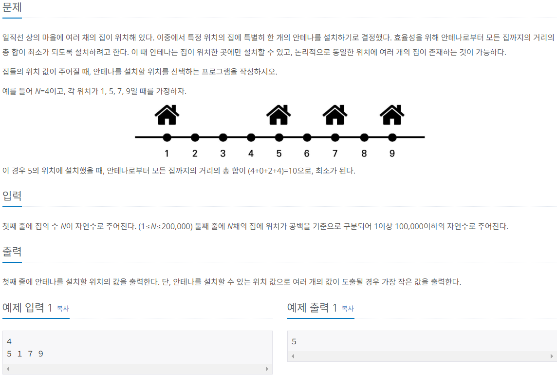 맨처음에는 단순하게 브루트 포스로 해결하고자 하였다. 모든 집을 순회하며 안테나를 설치하고 길이들을 비교하였는데, 시간초과가 발생했다. 그래서 굳이 모두 비교할 필요없이 전체 집의 가운데만 비교해야겠다고 생각하였다.(가운데에 위치한 집들의 값이 당연히 최소가 될 것이기 때문에) 그래서 홀수일 때와 짝수일 때를 고려하여 홀수일때는 중간꺼, 짝수일 때는 중간, 중간+1에 안테나를 설치할 경우만 계산하여 비교하여 통과하였는데, 답은 훨씬 간단했다..