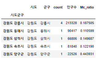 [04행]: 인구수 대비 공공보건의료기관 비율울 구하여 mc_ratio 컬럼에 추가한다.
