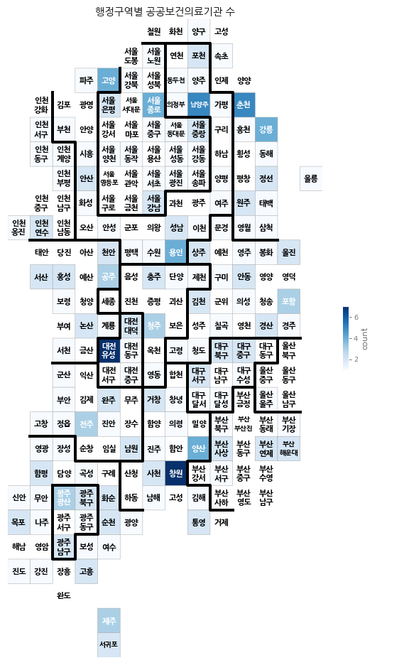 draw_blockMap(data_draw_korea_mc_population,'count','행정구역별 공공보건의료기관 수','Blues')