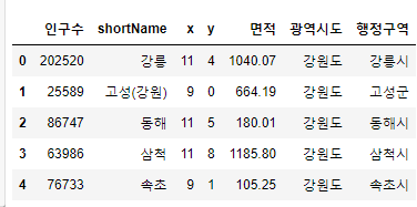 # 광역시는 구 이름이 겹치는 경우가 많아서 시단위 이름도 같이 표시한다. (중구, 서구)if row['광역시도'].endswith('시') and not row['광역시도'].startswith('세종'):