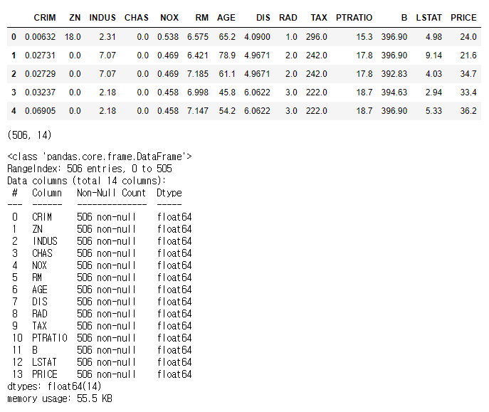 보스턴 주택 가격데이터는 공개 데이터셋으로 사이킷런에 내장되어 있다.