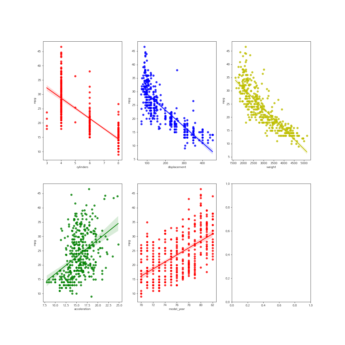 fig=sns.regplot(x=feature, y='mpg',data=data,ax=axes[row][col],color=plot_color[i]).get_figure()