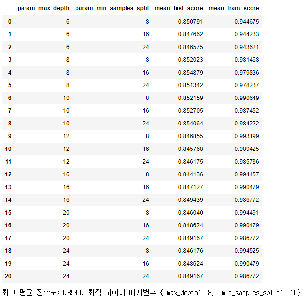 print("최고 평균 정확도:{0:.4f}, 최적 하이퍼 매개변수:{1}".format(grid_cv.best_score_,grid_cv.best_params_))