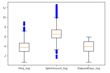 ax.boxplot([customer_df['Freq_log'],customer_df['SaleAmount_log'],customer_df['ElapsedDays_log']],sym='bo')