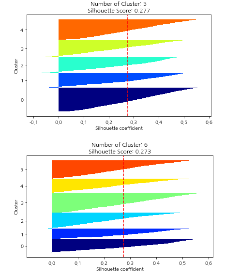 위 결과를 통해서 클러스터의 비중이 한쪽으로 치우치지 않고 비슷하면서 실루엣 계수가 높은 것은 군집의 갯수를 4로 정했을 때이다.