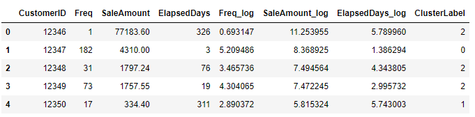 customer_cluster_df = customer_df.drop(['Freq_log', 'SaleAmount_log', 'ElapsedDays_log'],axis=1, inplace=False)