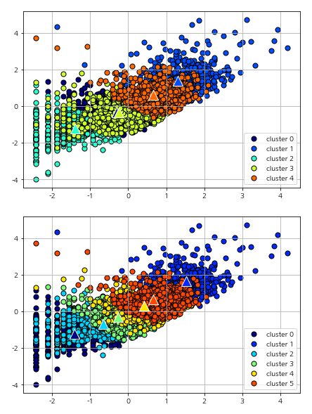 #각 클러스터의 중심점을 삼각형으로 표시for i in range(n_cluster):