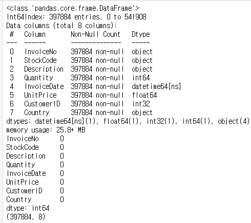 데이터의 정보를 봤을 때, CustomerID의 자료형이 실수이므로, 정수형으로 바꿔줘야 하고, 또한 null값이 있으므로, CustomerID가 없는 데이터는 제거한다. 추가로 Quantity와 UnitPrice가 음수인 것을 제거한다.