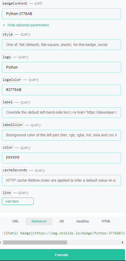 logo={simpleicons사이트에서 복사}, logocolor=아이콘색상, color=바탕색상 뭐 이런식으로 설정하면 된다. 밑에 execute를 해보면 먼저 확인할 수 있다.