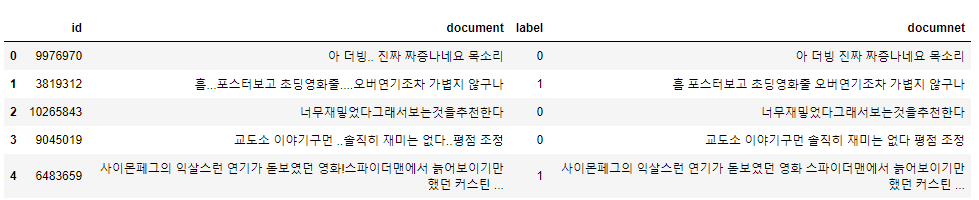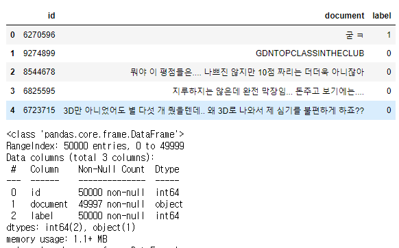 데이터의 정보를 봤을 때, document에 결측치가 5개 존재하는 것을 볼 수있다.