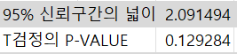 다음으로 신뢰구간을 계산해볼 것인데 excel에는 CONFIDENCE.T()라는 함수가 있다. 인자는 신뢰구간의 넓이, 표본의 표준편차, 표본의 크기가 들어간다. 우리는 95프로의 신뢰구간을 구하기위해서 신뢰구간의 넓이는 0.05를, 표본의 표준편차에는 DIFEER속성에 STDEV()를 통한 표준편차를, 표본의 크기는 아까 제거하고 남은 표본의 크기 35를 넣어준다.