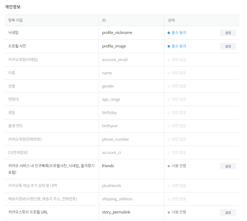 나의 경우에는 닉네임, 프로필사진, 카카오톡 메세지 전송에 동의를 설정해줬다.