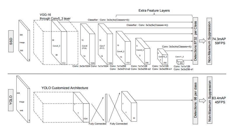 SSD의 가장 큰 특징은 위에서 말했듯이, 각 단계별 Feature map에서 object detection을 수행함으로써 큰 피쳐맵에서는 작은 물체를, 작은 피쳐맵에서는 큰 물체를 정확하게 탐지하였다.