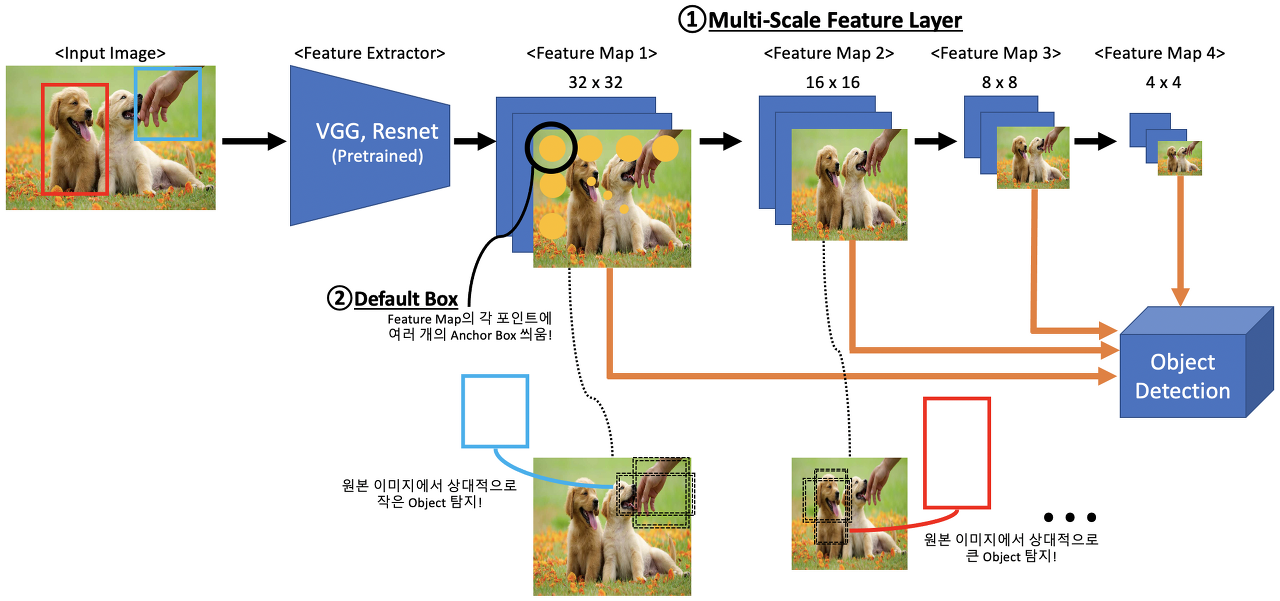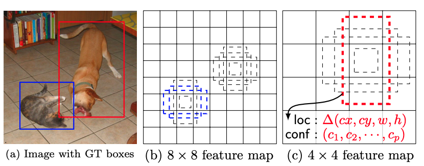위와 같이, VGG NET을 거치면서 각 단계별에서 추출된 feature map들은 왼쪽 그림의 구조를 거쳐서 object detection을 수행하게 된다. 우선 이미지를 그리드로 나눈뒤 각각의 그리드마다 크기가 다른 default box를 생성한다.(이는 Faster R-CNN의 anchor과 같은 역할을 한다.) 총 6개의 스케일의 피쳐맵의 각 그리드 한칸(셀)에 적용한다.