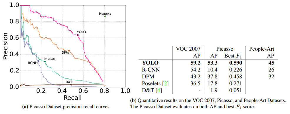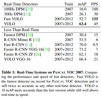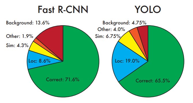 YOLO는 1-Stage Detector로 빠른속도를 보였으며, slidinge window나 region proposal 기반의 다른 모델과 달리 전체 이미지를 통해 학습시킴에 따라 맥락정보를 학습하여 배경 영역을 객체로, 인식하는 오류가 Fast R-CNN보다 적다고 한다.