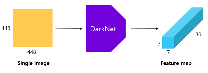 YOLO는 하나의 CNN 네트워크 구조(VGG네트워크를 변형하여 저자가 만든 DarkNet)로 이루어져 있고 하나의 이미지를 넣어주면 모든 SxS의 그리드 셀에 대한 결과를 한 번에 출력하기 때문에 속도가 빠르다. 논문에서는 그리드의 크기 S=7로 설정하였다.