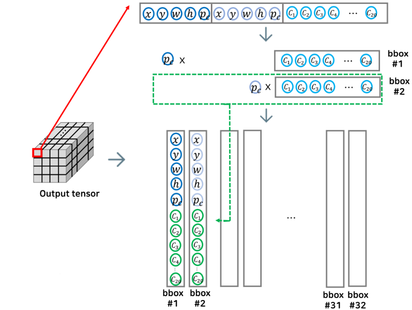 마지막으로 각 그리드의 Bbox의 confidence score과 class 확률 (20개)를 곱해준다.