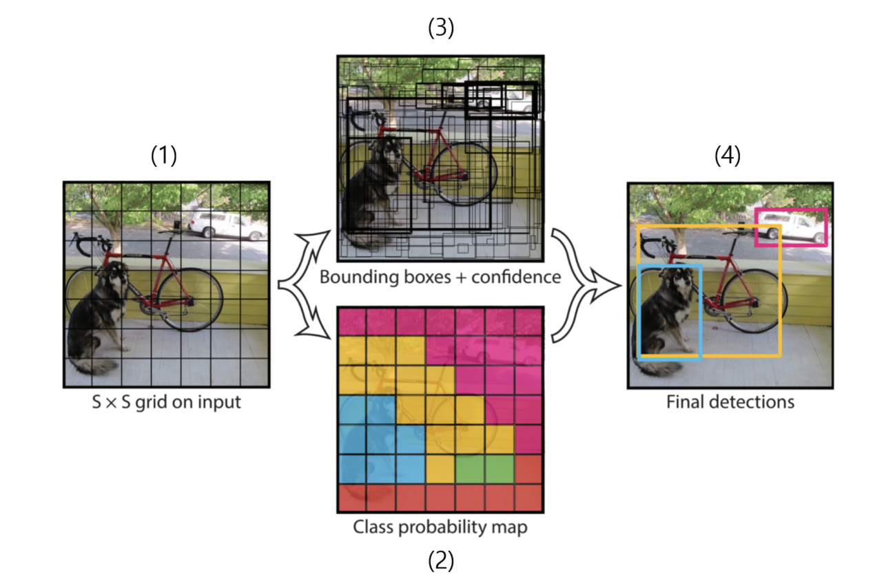 YOLO는 우선 이미지를 SxS 크기의 grid로 나눈다.
