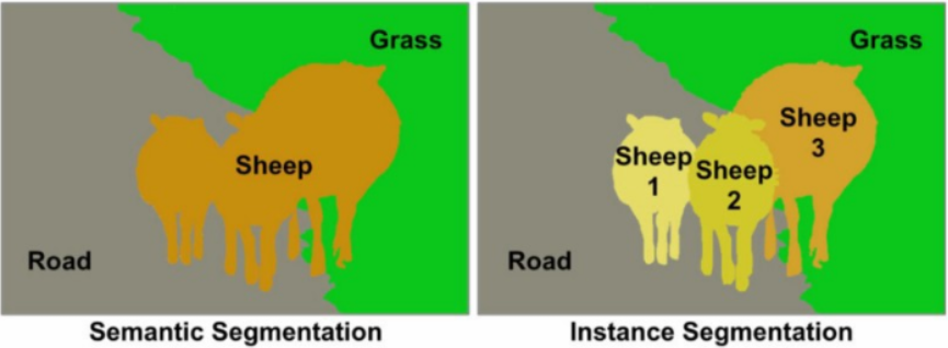- Semantic segmentation과의 차이점으로 위 그림에서 볼 수 있듯이 동일한 객체에 대해 다른 instance로 인식한다.(semantic에서는 모두 sheep이지만, instance에서는 sheep1, sheep2, sheep3)