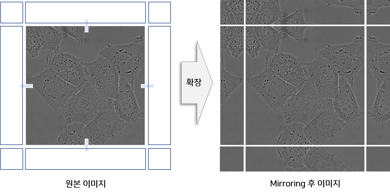 이미지의 경계 부분을 예측할 때에는 Padding을 넣어 활용하는 경우가 일반적인데 본 논문에서는 이미지 경계에 위치한 이미지를 복사하고 좌우 반전을 통해 Mirror 이미지를 생성한 후 원본 이미지의 주변에 붙여 Input으로 사용한다.