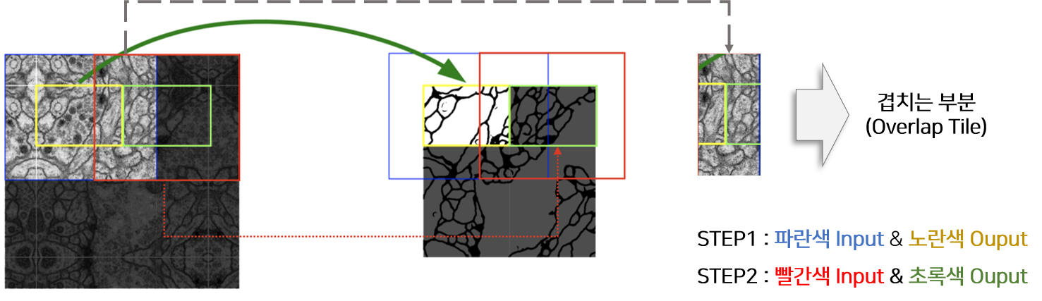 따라서 U-net에서는 이미지의 크기가 큰 경우 이미지를 자른 후, 각 이미지에 해당하는 Segmentation을 진행하는데, U-Net은 Input과 Output의 이미지 크기가 다르기 때문에 위 그림에서 처럼 파란색 영역을 Input으로 넣으면 노란색 영역이 Output으로 추출된다. 동일하게 초록색 영역을 Segmentation 하기 위해서는 빨간색 영역을 모델의 Input으로 사용해야 한다. 즉 겹치는 부분이 존재하도록 이미지를 자르고 Segmentation하기 때문에 Overlap Tile이라고 논문에서는 명칭 한다.