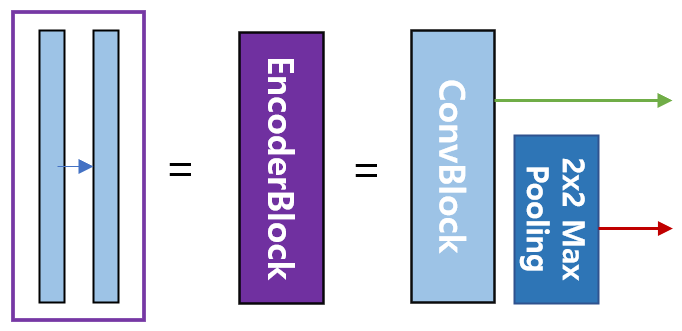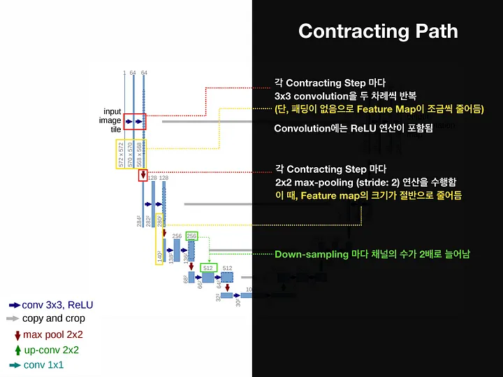 또한 conv Block을 감싸는 보라색은 인코더블록을 의미하며, 빨간색 선은 2x2 max pooling을 하며 다운 샘플링을 한 후 인코더의 다음 단계로 내보내고, 초록색선은 디코더로 복사하기 위한 skip connection을 나타낸다.(전체 그림을 보는 게 이해가 잘 갑니다) 이 Downsampling 과정에서 convolution layer을 거칠 때 패딩을 주지 않아 이미지의 크기가 작아진다.