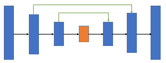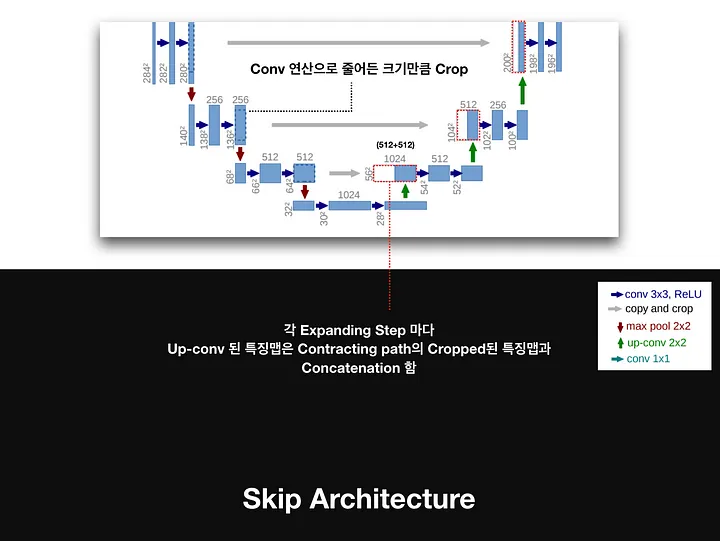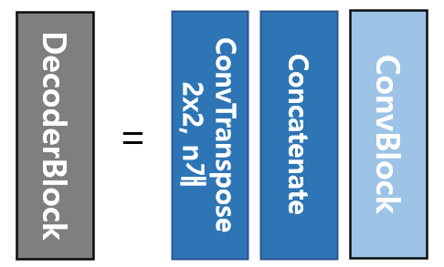 다음으로 디코더 블록의 파란색은 인코더의 convBlock과 동일하며, 녹색블록은 skip connection을 통해서 인코더에서 각 cov layer에서 추출된 featuremap을 복사한 것이다.