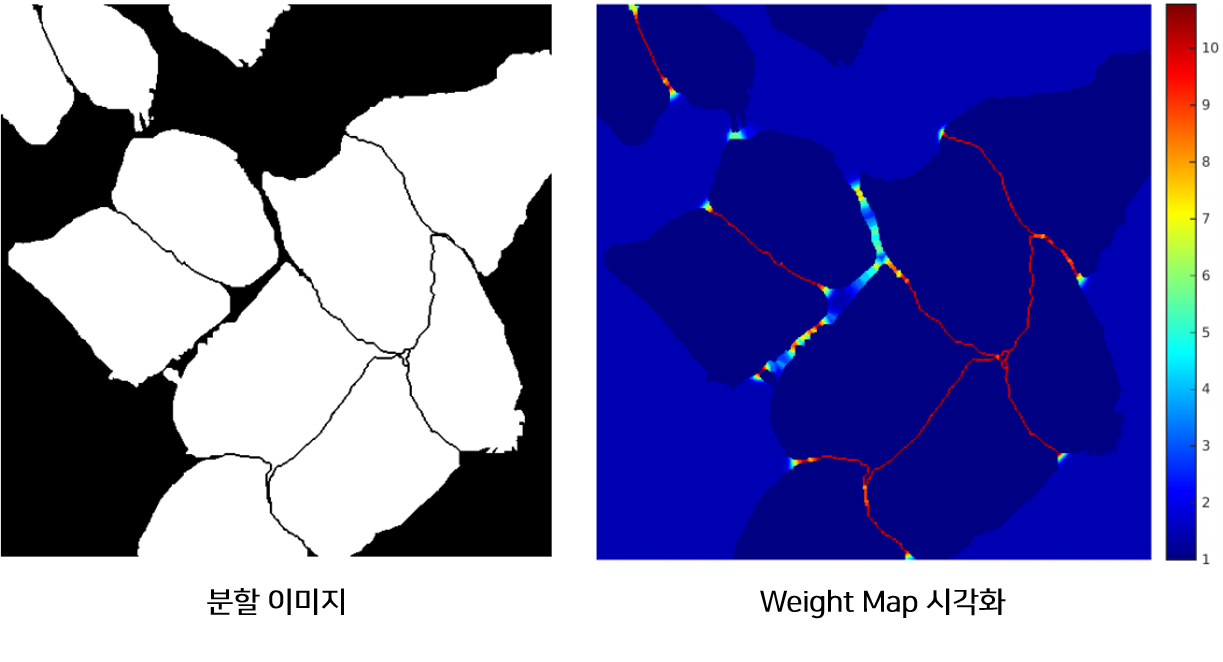 모델은 위 그림처럼 작은 경계를 분리할 수 있도록 학습되어야 하기 때문에. 논문에서는 각 픽셀이 경계와 얼마나 가까운지에 따른 Weight-Map을 만들고 학습할 때 경계에 가까운 픽셀의 Loss를 Weight-Map에 비례하게 증가시킴으로써 경계를 잘 학습하도록 설계하였다