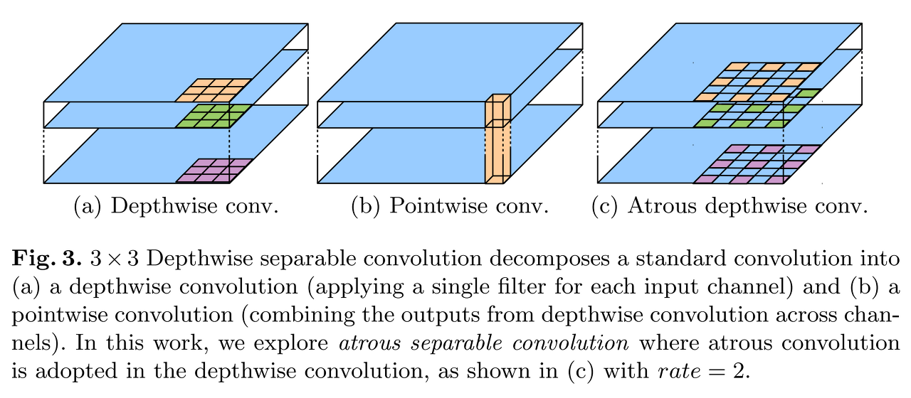 이 논문에서는 Astrous convolution에다 Depthwise separable convolution을 적용시켰고, 이를 astrous separable convolution이라고 부르고 있습니다. astrous separable convolution을 적용 시에 모델의 성능은 비슷하게 유지되고 연산 복잡도는 크게 감소되었다고 한다.