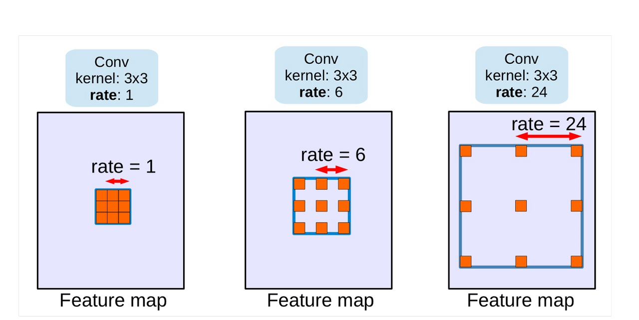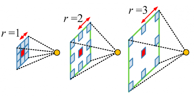 Atrous에서 trous는 구멍(hole)을 의미함으로써, Atrous Convolution은 기존 Convolution과 다르게 필터 내부에 빈 공간을 둔 채 작동하게 된다. 위 그림에서 얼마나 빈 공간을 둘지 결정하는 파라미터값 r(rate의 약자)이 1인 경우, 기존 Convolution과 동일하고 r이 커질수록 빈 공간이 넓어지게 되는 것이다.