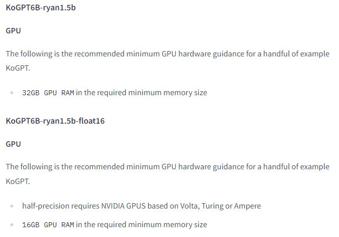 안녕하세요 우선 모델의 공개에 대하여 진심으로 감사 드립니다. 세부 내용중에 보면 다음과 같은 내용이 있습니다. GPU The following is the recommended minimum GPU hardware guidance for a handful of example KoGPT. ha