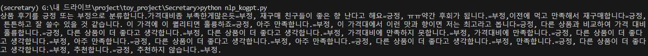 이런식의 prompt를 입력할 때, 저기 마지막처럼 "훌륭하죠=" 로 끝내야, 저 튼튼하고~훌륭하죠가 긍정 부정인지를 대답한다. 그렇지 않으면 이상한 말을 내뱉는다. (실제 돌려보니, 긍정이라고 하고 뒤에는 또 이상한 단어들~)